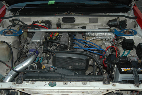 Fully Balanced 4AGE, 5Zigen Stainless 4-2-1 Extractors, BuddyClub Spec II Exhaust (Under Diff), 2.5″ Tip, TRD Engine Mounts lowered 1cm and strengthened, Transmission Mounts same as Engine Mounts, TRD Leads, Air Filter, 2Core Radiator, Greddy ECU